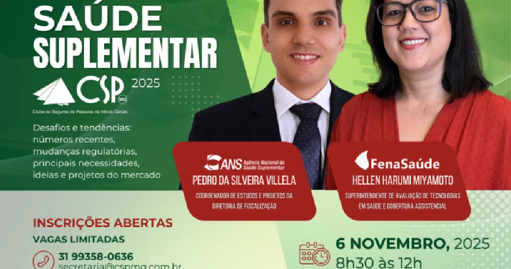O Clube de Seguros de Pessoas de Minas Gerais (CSP-MG) realiza, no dia 6 de novembro, em Belo Horizonte, das 8h30 às 12h, o Seminário Saúde Suplementar – Desafios e Tendências. O encontro contará com a participação de representantes da Federação Nacional de Saúde Suplementar (FenaSaúde) e da Agência Nacional de Saúde Suplementar (ANS).